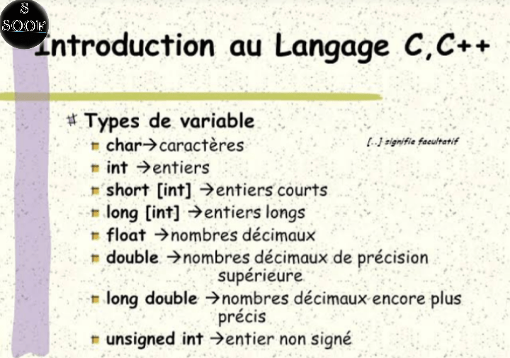 Une variable est un objet repéré par son nom, pouvant contenir des données, qui pourront être modifiées lors de l’exécution du programme. Les variables en langage C++ sont typées, c’est-à-dire que les données contenues dans celles-ci possèdent un type, ainsi elles sont donc stockées à une adresse mémoire et occupent un nombre d’octets dépendant du type de donnée stockée.